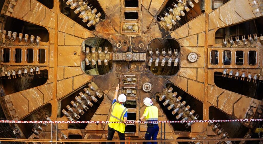 Metoda TBM (tunnel boring machine) polega na drążeniu przy użyciu tarczowych maszyn tunelowych, które umożliwiają realizację długich tuneli o dużych przekrojach w zwartej zabudowie miejskiej lub pod przeszkodami terenowymi. Technologia ta gwarantuje wysoką precyzję, bezpieczeństwo oraz minimalne oddziaływanie na powierzchnię terenu. Drążenie rozpoczyna się w komorze startowej, gdzie maszyna TBM zostaje zmontowana i uruchomiona, a następnie przemieszcza się w kierunku komory odbiorczej, równocześnie montując segmentową obudowę tunelu. Mimo wysokich kosztów mobilizacji TBM stanowi obecnie jedno z najbardziej zaawansowanych rozwiązań w budownictwie podziemnym, szczególnie w realizacji metra i tuneli komunikacyjnych.
