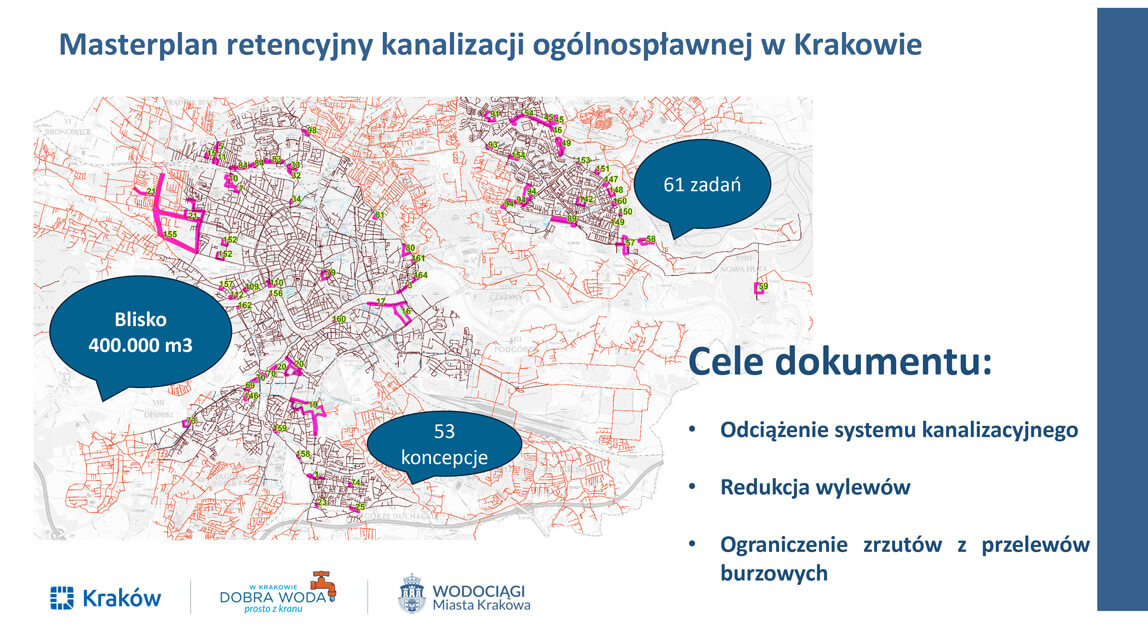 Modernizacje obejmują przebudowy kolektorów kanalizacji ogólnospławnej, nowe podejście do funkcjonowania przelewów burzowych, budowę zbiorników oraz kolektorów retencyjnych. Wszystkie te działania są spójne dzięki opracowaniu masterplanu retencyjnego dla Krakowa. Celem tych działań jest zwiększenie odporności infrastruktury na opady ekstremalne i ograniczenie negatywnego wpływu zrzutów burzowych.