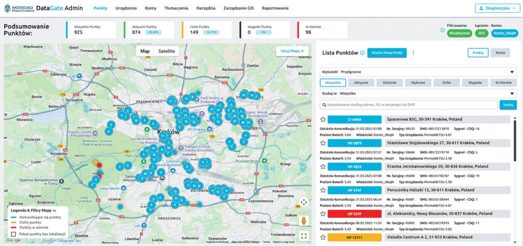 zespołów terenowych. Dane z posiadanych urządzeń detekcyjnych są agregowane w postaci wizualnej oraz alarmowej. Obecnie Wodociągi Miasta Krakowa posiadają 984 takie urządzenia, a w planach jest rozbudowa systemu do ok. 1500.