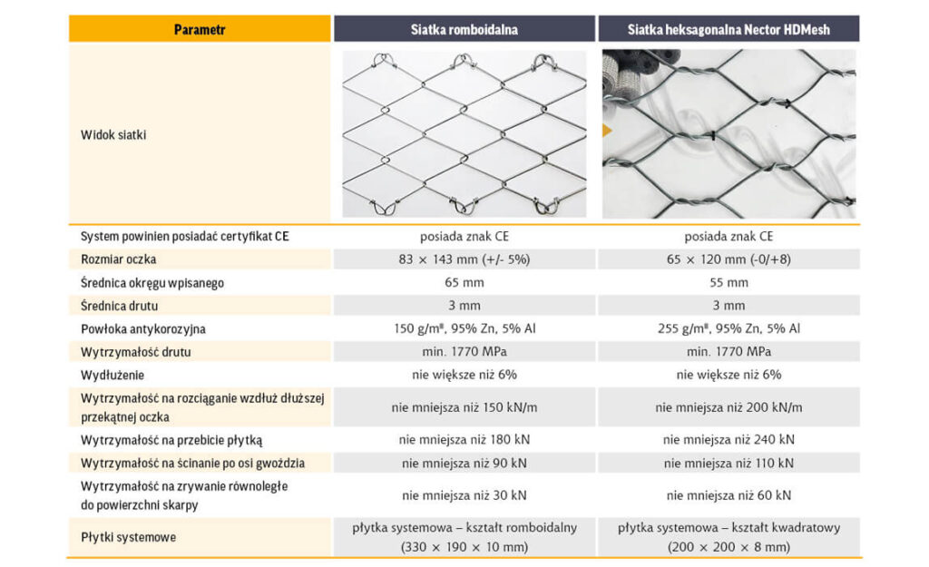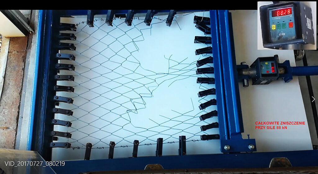 Cały efekt badań został opisany w „Archives of Civil Enginrering” (https://ace.il.pw.edu.pl/Laboratory-testing-as-a-base-for-numerical-modelling-of-the-high-strength-hexagonal,162470,0,2.html). Powyżej przedstawiono w tabeli porównanie parametrów siatek romboidalnych oraz podwójnie skręcanych siatek heksagonalnych wykonanych z drutu o średnicy 3 mm.