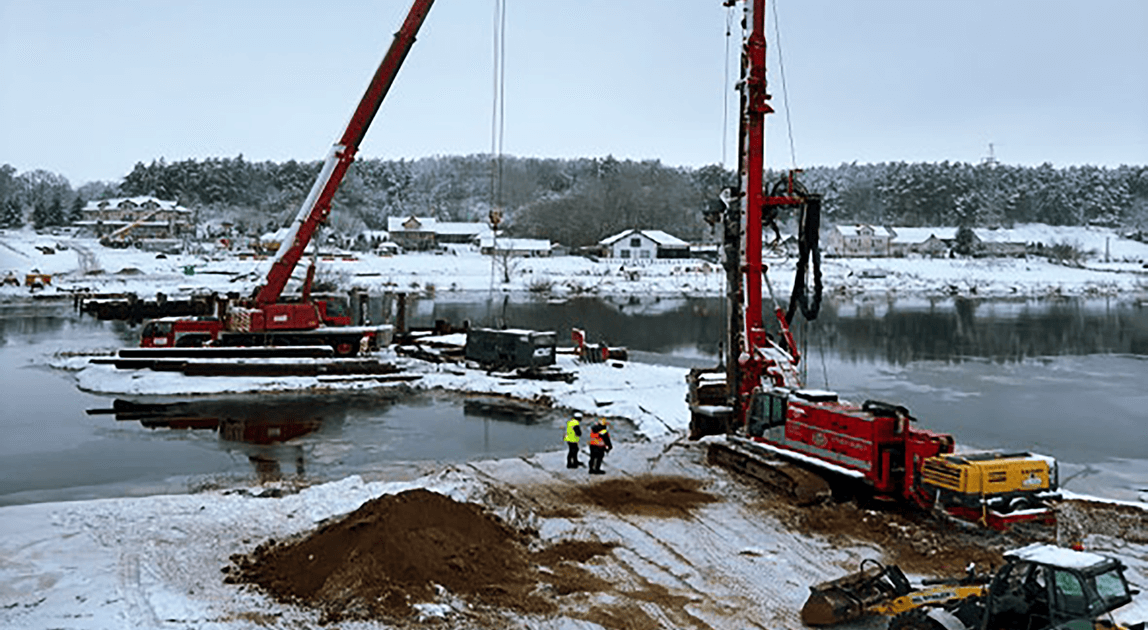 Najtrudniejszym do realizacji etapem są niewątpliwie prace związane z podporą nurtową P3. Wykorzystano tu, podobnie jak przy rozbiórce starego mostu, pontony W-2, z których przy użyciu ciężkiego sprzętu wykonano takie prace, jak pogrążenie 15-metrowych pali prefabrykowanych przy użyciu 70-tonowej palownicy oraz wykonanie komory ze ścianek szczelnych za pomocą dźwigu ustawionego na pontonie.