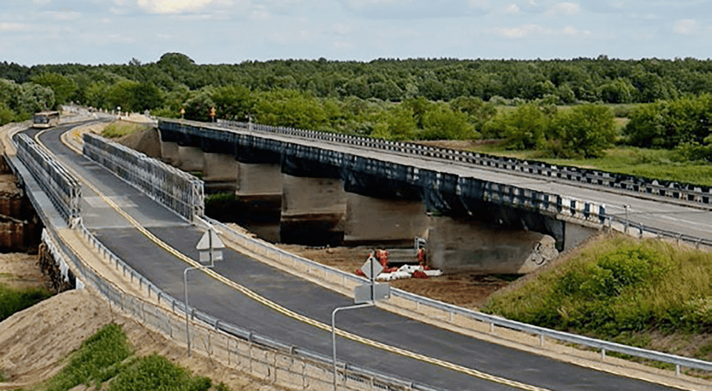 Zespół STRABAG przejął teren w lipcu 2023 r. i przystąpił do przebudowy kolizji, adaptacji drzew i krzewów oraz rozpoczął budowę drogi objazdowej. W pobliżu istniejącego mostu powstał trójprzęsłowy most tymczasowy ACROW 700 XS o rozpiętości 113 m, szerokości jezdni 7,2 m wraz z chodnikiem o szerokości 1,50 m.