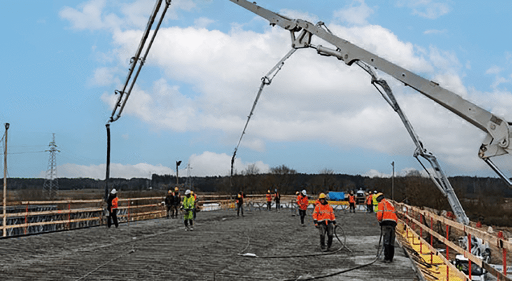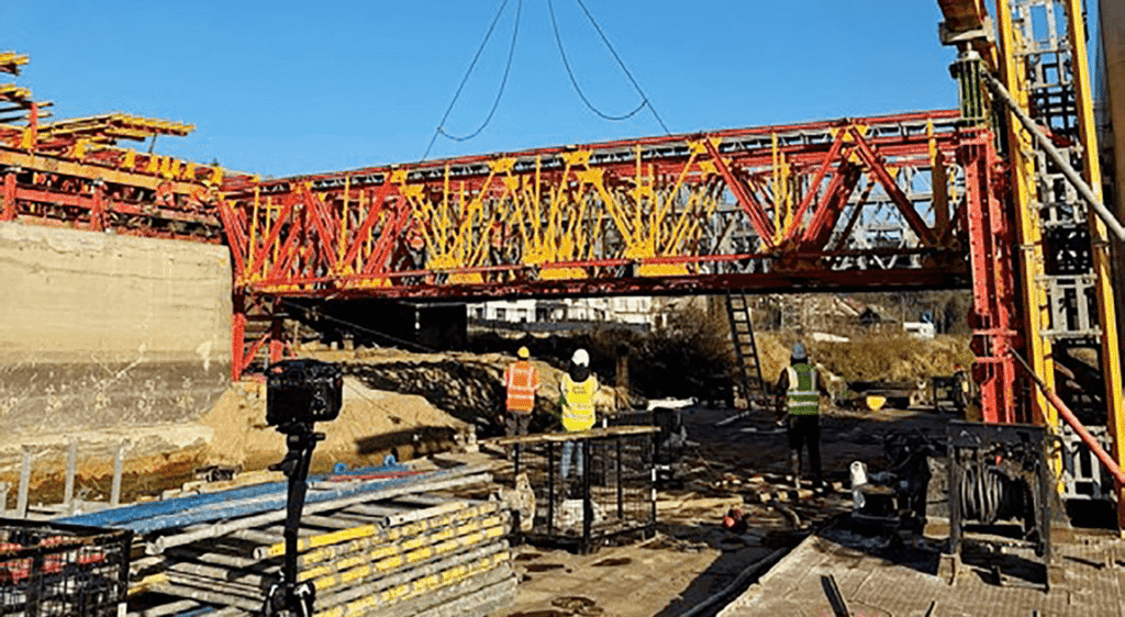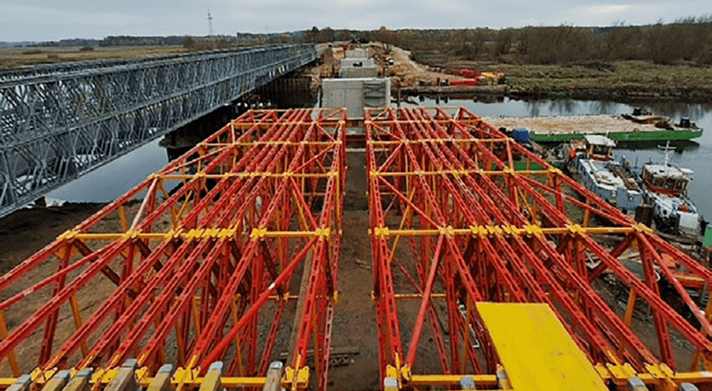 Natomiast przy przęśle nurtowym zastosowano kratownice VRB (ciężkie) o rozpiętości 27,8 m, które zostały częściowo sprefabrykowane w magazynie PERI i dostarczone na budowę w gotowych segmentach.