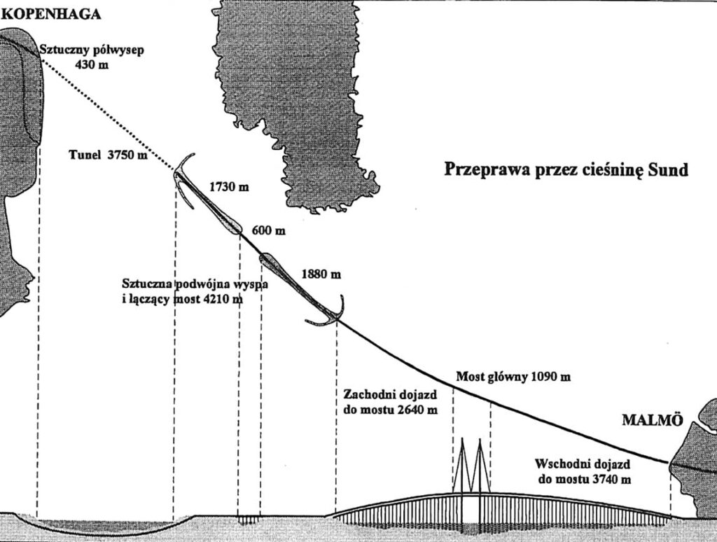 W 1994 r. miałem okazję zwiedzić w Malmö wystawę pokonkursową poświęconą projektowi przeprawy przez cieśninę Sund. Spośród nadesłanych propozycji wybrano dwie wiodące. Pierwsza zakładała budowę dwupoziomowej konstrukcji stalowej z głównym przęsłem podwieszonym, na której górnym pomoście planowano umieścić dwie jezdnie autostrady, a na dolnym – dwutorową linię kolejową. Druga, alternatywna koncepcja przewidywała konstrukcję z betonu sprężonego, w której ciągi komunikacyjne znajdowały się na jednym poziomie przy zachowaniu układu podwieszonego w części głównej. Ostateczny wybór wariantu miał zostać dokonany w przetargu według kryterium ceny. Oba rozwiązania zostały szczegółowo opisane przez autora niniejszej notatki w artykule Skandynawskie połączenia komunikacyjne, zamieszczonym w numerze 9. czasopisma „Inżynieria i Budownictwo” z 1995 r.