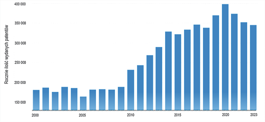 W Stanach Zjednoczonych od 2012 r. patenty przyznawane są na 20 lat z możliwością przedłużenia na kolejne lata, w Polsce to maksymalnie 20 lat od daty zgłoszenia. Patent jest ważny w kraju, w którym został wydany, ale istnieje możliwość uzyskania ochrony wynalazku w innych krajach świata. Po okresie wygaśnięcia patentu staje się on dobrem publicznym, a tym samym przyczynia się do powszechnego rozwoju techniczno-technologicznego. Jest wiele powodów, dla których patenty są zgłaszane do urzędów patentowych. Jest to ochrona rozwiązań przed nieautoryzowanym wykorzystaniem przez osoby lub firmy, komercjalizacja wynalazku, a więc zwiększenie zysków, wzrost wartości rynkowej asygnowanej firmy, kontrolowanie działań konkurencji w danej dziedzinie czy wreszcie podniesienie prestiżu wynalazcy. W USA w 2023 r. wydano blisko 350 tys. patentów (ryc. 1), dla porównania w tym samym roku w Polsce było to skromne 2208 patentów (ryc. 2). Zastanawiająca jest tak ogromna dysproporcja. Zapewne przyczyn jest wiele i nie wiążą się one wyłącznie z brakiem innowacyjności lub inżynieryjnej kreatywności w naszym kraju.