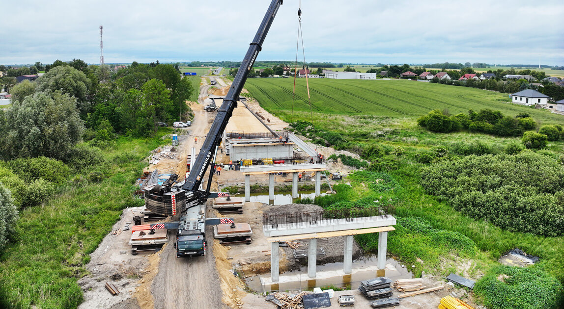 Belki, o wadze 27 t każda, zostały zamontowane za pomocą żurawia samojezdnego o udźwigu 500 t, którego maksymalny wysięg wynosił ok. 33 m. Trudne warunki gruntowe po raz kolejny dały o sobie znać – wyzwaniem było przygotowanie stanowiska dla żurawia. Pod każdą z czterech łap żurawia konieczne było zrobienie stabilnej podstawy. Stanowisko żurawia zostało wykonane z pogrążonych metodą wibracyjną pięciu rur stalowych Ø508 mm o długości od 17 do 23 m, zwieńczonych rusztem stalowym wykonanym z kształtowników HEB oraz IPE, na którym ułożono dwie warstwy żelbetowych płyt drogowych.
