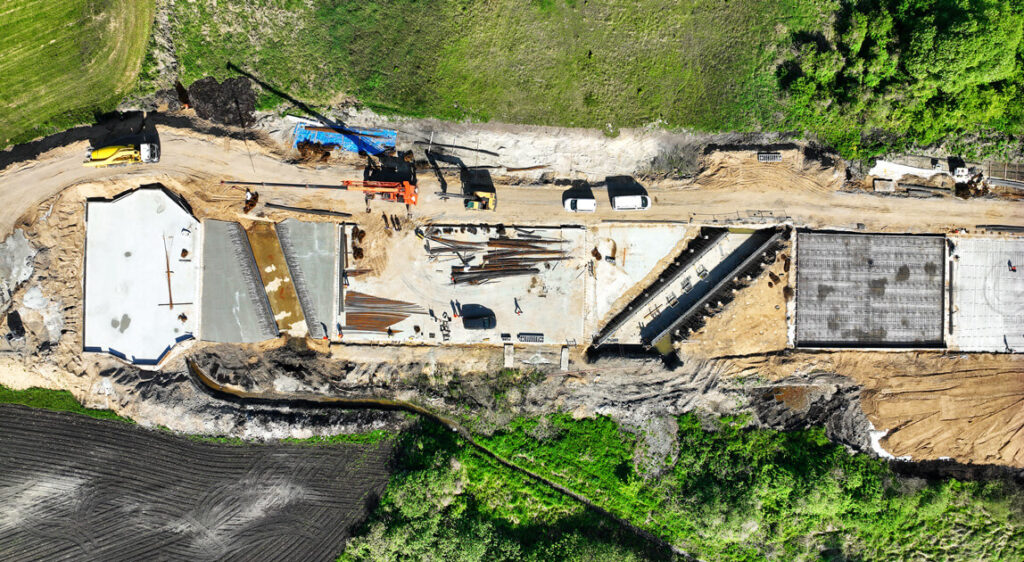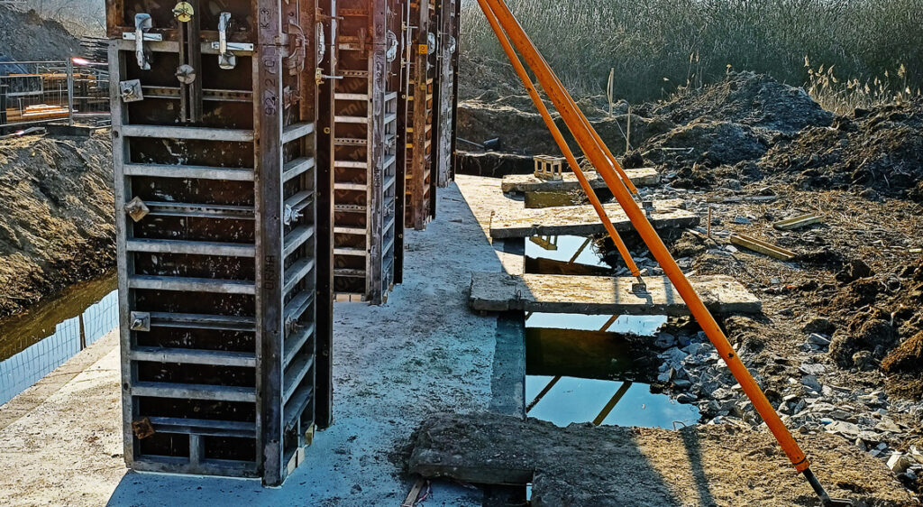 W dalszej części zostały wykonane roboty żelbetowe podpór w celu przygotowania miejsc osadzania prefabrykowanych belek ustroju nośnego. Podpory skrajne w postaci przyczółków masywnych zostały odciążone od parcia zasypki. Odciążenie zrealizowano przy użyciu pasm geotkaniny jednokierunkowej.