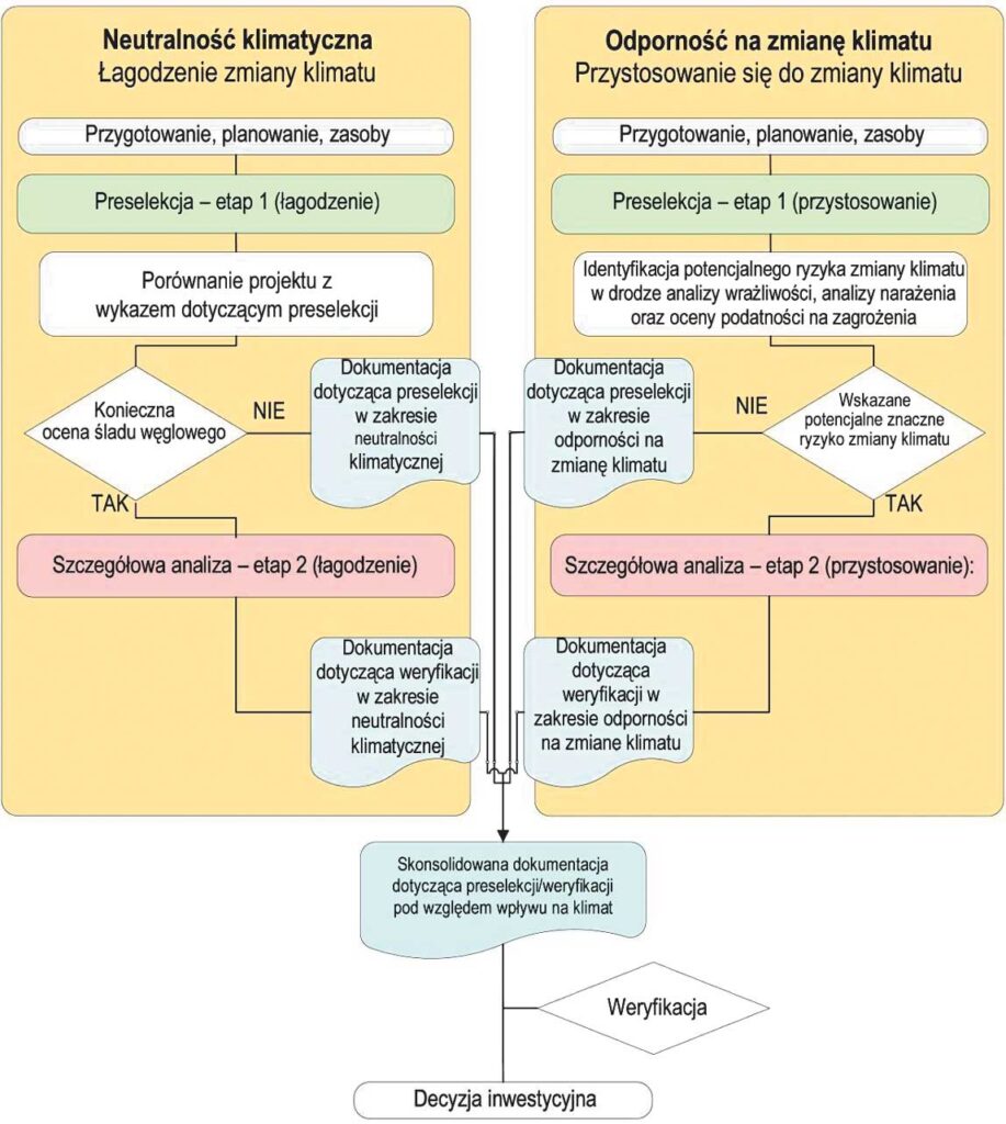„Zgodnie z wytycznymi KE weryfikacja klimatyczna powinna być przeprowadzana dla całego cyklu życia projektu, od etapu strategicznego planowania do etapu likwidacji i opiera się na dwóch filarach: weryfikacji neutralności klimatycznej potwierdzającej zgodność projektu z celem neutralności klimatycznej do 2050 r. oraz weryfikacji odporności klimatycznej potwierdzającej odporność infrastruktury na możliwe do przewidzenia zagrożenia klimatyczne w całym okresie eksploatacji infrastruktury, od początkowych etapów do fazy likwidacji” (ryc. 1).