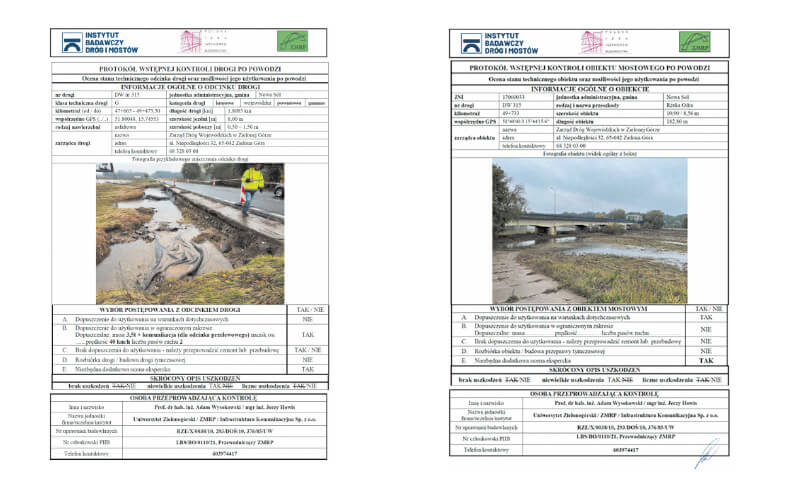 W celu uproszczenia procedur oraz przyspieszenia procesu oceny szkód IBDiM zainicjowało opracowanie wzorów specjalnych protokołów popowodziowej oceny stanu infrastruktury. Dokumenty te zostały stworzone osobno dla dróg oraz dla konstrukcji inżynieryjnych, co maksymalnie uprościło i ujednoliciło procedurę szacowania strat. Standaryzacja procesu oceny zniszczeń wyeliminowała niepotrzebne formalności oraz usprawniła pracę zespołów dokonujących inspekcji terenowych. Jest to ważny przykład skutecznej koordynacji działań na rzecz ograniczenia zbędnych procedur w sytuacjach kryzysowych, co znacząco skróciło czas niezbędny na sporządzenie rzetelnych raportów z miejsc objętych skutkami powodzi. Na rycinie 11 przedstawiono przykładowe wzory opracowanych arkuszy oceny popowodziowej dla obiektu mostowego i odcinka drogi.