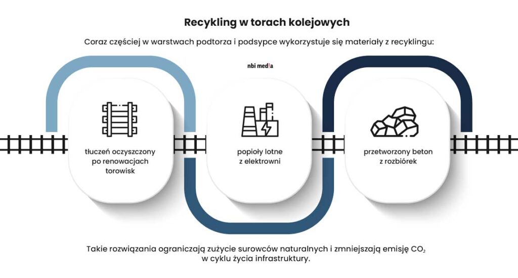 Do jednych z najbardziej innowacyjnych materiałów należą betony wysokowartościowe HPC i UHPC o podwyższonej szczelności i trwałości, a także maty i kompozyty poliuretanowe, ograniczające hałas i wydłużające cykl życia konstrukcji. Coraz częściej wprowadzane są również podkłady z materiałów z recyklingu – tworzyw sztucznych i gumy kolejowej – które ograniczają zużycie betonu i emisję CO2. W fazie intensywnego rozwoju są materiały samoistnie naprawiające się (self-healing), inteligentne kompozyty z funkcją monitorowania naprężeń oraz powłoki fotokatalityczne, zwiększające odporność konstrukcji na korozję i zabrudzenia. Zdaniem ekspertów to właśnie one staną się podstawą smart track – inteligentnych torowisk nowej generacji.