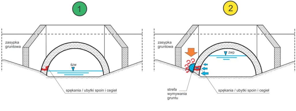 Drugim istotnym zagadnieniem technologicznym jest właściwe utrzymanie i konserwacja istniejących przepustów oraz obiektów towarzyszących, takich jak mury oporowe, skrzydła i przyczółki. Praktyka inżynieryjna dowodzi, że liczne uszkodzenia obiektów występują nie wskutek bezpośredniego działania powodzi, lecz w wyniku długotrwałego braku konserwacji, prowadzącego do powstawania ubytków zaprawy, spoin i cegieł w konstrukcjach murowych [6, 7]. Miejsca te stanowią punkty zapalne konstrukcji – strefy inicjacji zniszczeń, w których podczas przepływu wezbraniowego woda penetruje spoiny i zaczyna „rozbierać” obiekt metodą cegła po cegle. Schemat ten przedstawiono na rycinie 11.