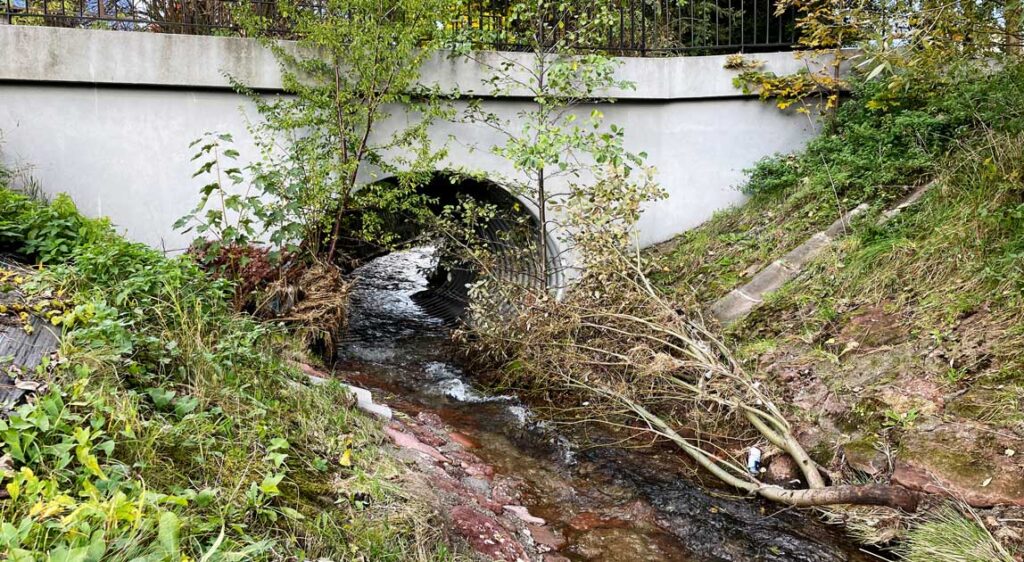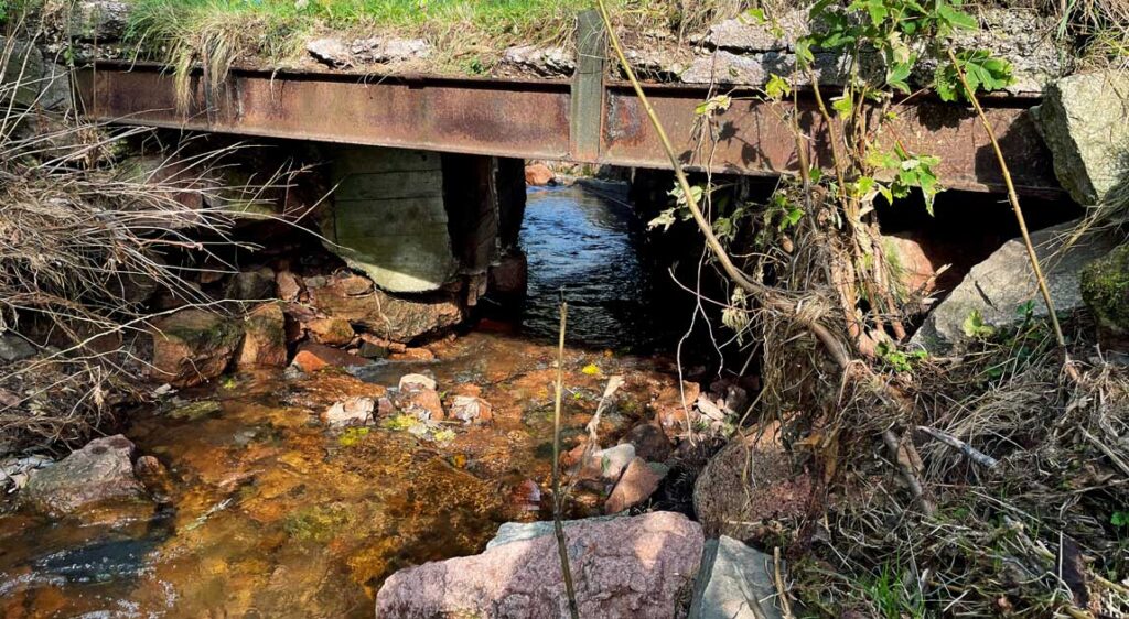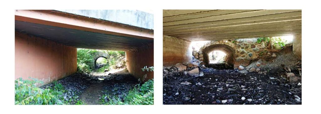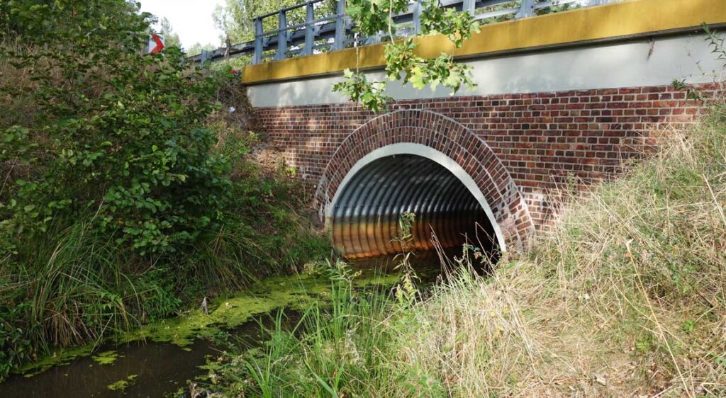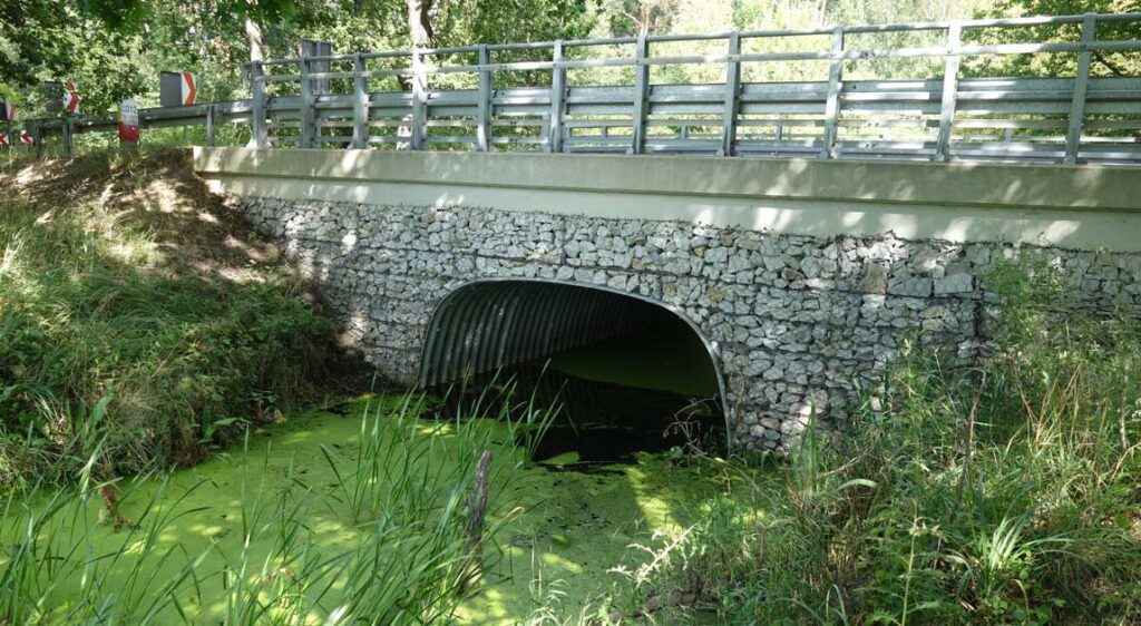 Jednym z głównych problemów pozostaje brak włączenia przepustów do planów działań mających na celu ograniczanie zasięgu powodzi. Obiekty te w praktyce projektowej traktowane są zazwyczaj jako elementy liniowe towarzyszące drodze, a nie jako integralne elementy systemu odwodnieniowego i retencyjnego całej zlewni. Tymczasem ich lokalizacja, przekrój hydrauliczny, geometria wlotu i wylotu, czyli sposób włączenia do koryta cieku, mają bezpośredni wpływ na poziomy wód w przepustach w czasie wezbrań. Przykładem mogą być sytuacje, w których pozostawia się obiekty istniejące (przepusty) w ciągach dróg drugorzędnych przecinających ten sam ciek wodny (ryc. 12).