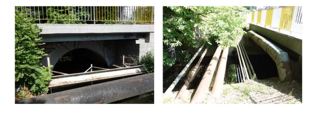 W wielu przypadkach zbyt mała przepustowość lub niewłaściwie ukształtowane wloty prowadzą do spiętrzeń, które następnie powodują zalewanie terenów położonych powyżej drogi lub nasypu kolejowego. Dotyczy to również lokalizowania urządzeń obcych w postaci rurociągów w bezpośrednim obrębie przepustów, stanowiących zagrożenie w czasie powodzi zarówno dla obiektów inżynieryjnych, jak i dla przesyłanych mediów niezbędnych z punktu widzenia funkcjonowania mieszkańców (ryc. 13).