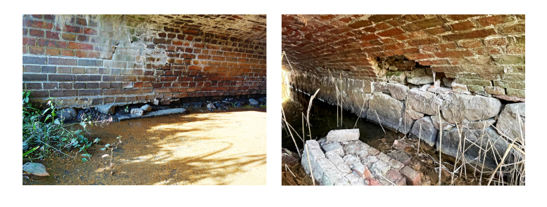 Jednym z podstawowych wymagań technologicznych jest konieczność stosowania odpowiednich umocnień nasypów w obrębie przepustów i terenu przyległego. Obecne doświadczenia krajowe, poparte również praktykami stosowanymi w inżynierii hydrotechnicznej na świecie, wskazują na wyraźną potrzebę rezygnacji z elementów małowymiarowych (np. cegły, kostki kamiennej lub płyt ażurowych) na rzecz ciężkich narzutów kamiennych lub gabionów posadowionych na podłożu z betonu i geowłókniny. Takie rozwiązania zapewniają odpowiednią masę własną, zdolność do rozproszenia energii przepływu oraz trwałość w długim okresie użytkowania. Narzuty kamienne wykonane z materiału o uziarnieniu powyżej 200–400 mm tworzą stabilną warstwę, odporną na wypłukiwanie i przemieszczenia nawet przy dużych prędkościach przepływu. Przykładem newralgicznych punktów zapalnych konstrukcji w przypadku wystąpienia powodzi są uszkodzenia konstrukcji ceglanych, które cechują się podatnością na dalsze wymywanie materiału konstrukcyjnego – cięgieł, co pokazano na rycinach 9 i 10.