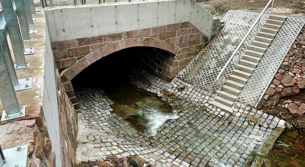 Proces ten ma charakter progresywny – nawet niewielkie uszkodzenie lica muru prowadzi do lokalnej utraty stateczności, a następnie do oderwania kolejnych elementów, co w warunkach dynamicznego przepływu wody może w krótkim czasie doprowadzić do całkowitego zniszczenia konstrukcji przepustu. Z tego względu kluczowe jest prowadzenie regularnych przeglądów konserwacyjnych obejmujących kontrolę stanu zapraw, spoin, elementów licowych i przyczółków, a także wykonywanie napraw ubytków w możliwie najwcześniejszej fazie ich występowania. W przypadku konstrukcji ceglanych i kamiennych zaleca się stosowanie zapraw kompatybilnych z materiałem pierwotnym, o zbliżonej paroprzepuszczalności i elastyczności (sztywności), co zapobiega powstawaniu lokalnych naprężeń wewnętrznych i dalszej degradacji.