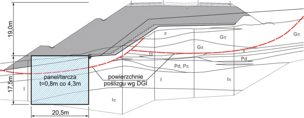Rozwiązanie [2] obejmowało zabezpieczenie nasypu drogowego w strefie osuwiskowej w postaci układu tarcz (paneli) wykonywanych w gruncie, umożliwiających znaczące ograniczenie przemieszczeń nasypu spowodowanych naporem mas ziemnych w rejonie osuwiska. Przewidziano tarcze o grubości 80 cm i długości w planie 18,5 oraz 20,5 m. Głębokość elementów (17,5 m) dobrano tak, aby zapewnić stabilne zakotwienia w gruncie, poniżej potencjalnych powierzchni poślizgu, określonych w dokumentacji geologiczno-inżynierskiej. Ich rozstaw osiowy wynosi 4,3 m. Tarcze zostały wykonane jako elementy niezbrojone w technologii ścian szczelinowych z wykorzystaniem mieszanki samozagęszczalnej o wymaganej wytrzymałości na ściskanie fck,cube = 20 MPa (fck = 16 MPa). Typowy przekrój przedstawiono na rycinie 1. Z uwagi na ciągłość i bardzo wysoką sztywność w płaszczyźnie poszczególnych tarcz, zrezygnowano z ich zbrojenia oraz ze stosowania elementów wieńczących w postaci oczepów żelbetowych.