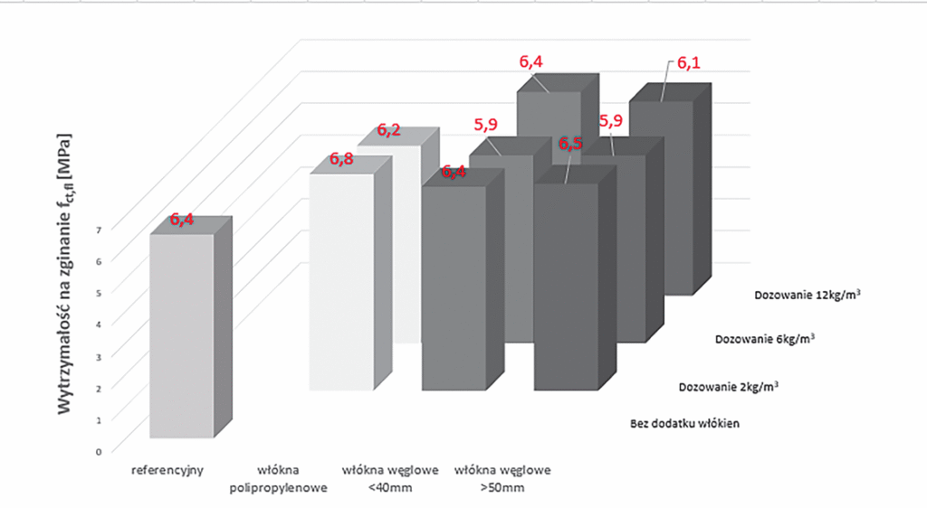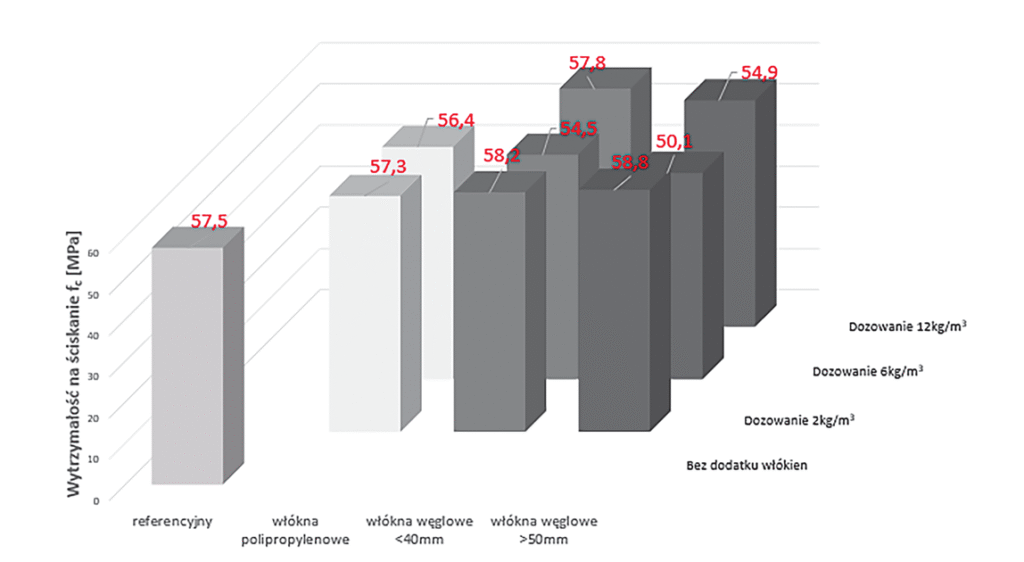 Zaprojektowana mieszanka betonowa miała spełniać standardowe wymagania specyfikacji technicznych dla betonu nawierzchniowego. Główny nacisk położono na parametry wytrzymałościowe, tj. wytrzymałość na ściskanie, zginanie i rozciąganie przy rozłupywaniu. Porównano wyniki badań mieszanki i stwardniałego betonu z receptur zarówno bez zbrojenia, jak i ze zbrojeniem z tradycyjnych włókien polipropylenowych i włókien węglowych o różnej długości pozyskanych z recyklingu turbin wiatrowych.