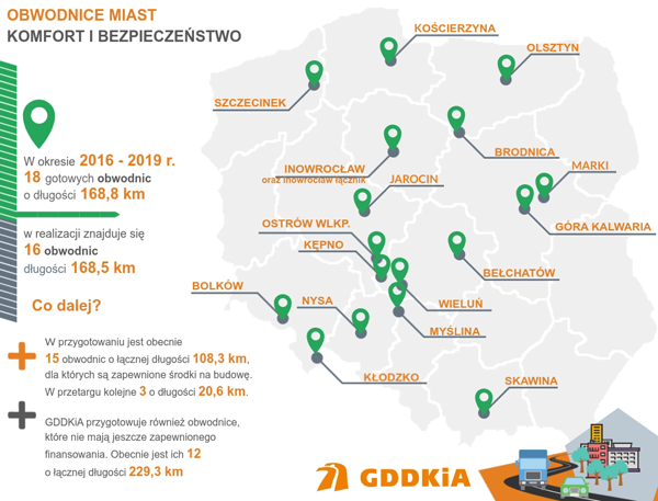 W realizacji jest obecnie 16 obwodnic miast o łącznej długości 168,5 km, a dla obwodnic: Wałcza (17,8 km), Ostrowca Świętokrzyskiego (ok. 3 km) i Oświęcimia (ok. 9 km) prowadzimy obecnie postępowanie przetargowe.
