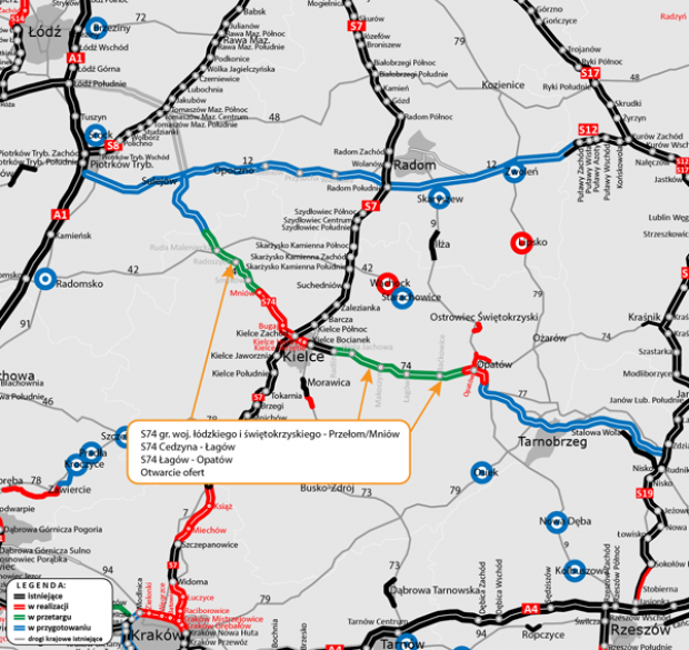 Przetargi na realizację trzech odcinków S74 o łącznej długości około 76 km ogłoszono pod koniec stycznia br. Zaprojektowaniem i wybudowaniem trasy od granicy z województwem łódzkim do Mniowa zainteresowanych jest 10 wykonawców. Złożone przez nich oferty w przedziale cenowym od ok. 1 mld do 1,2 mld zł mieszczą się w kwocie, jaką zamawiający przeznaczył na realizację inwestycji (ok. 1,3 mld zł). Średnia wartość ze złożonych ofert to około 86 proc. wartości kosztorysu GDDKiA, gdzie najniższa złożona oferta stanowiła 75 proc., z kolei najdroższa to 93 proc. Kryteriami oceny ofert w tym przetargu są: cena (waga kryterium 55 proc,) przedłużenie okresu gwarancji jakości na obiekty mostowe (20 proc.) oraz na inne elementy m.in. ekrany (20 proc.), a także wykorzystanie destruktu asfaltowego (5 proc.).