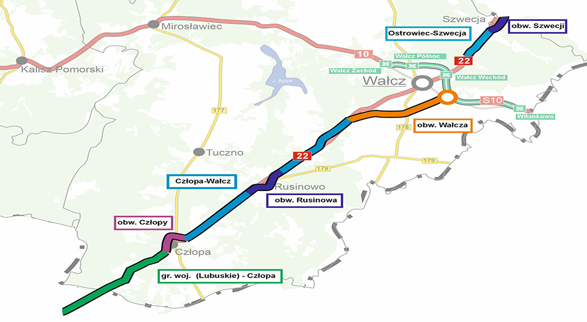 Inwestycja będzie składała się z dwóch pododcinków. Pierwszy biec będzie od końca obwodnicy Człopy do początku obwodnicy Rusinowa, a drugi od końca obwodnicy Rusinowa do początku obwodnicy Wałcza.