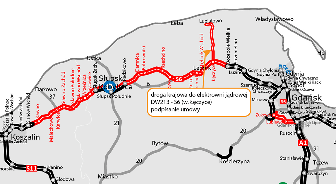 Gdański Oddział GDDKiA podpisał umowę na zaprojektowanie i budowę drogi krajowej do elektrowni jądrowej na odcinku od drogi wojewódzkiej nr 213 do węzła Łęczyce na S6. Wykonawcą inwestycji o wartości prawie 200 mln zł będzie konsorcjum firm: Aldesa Construcciones Polska i Aldesa Construcciones.